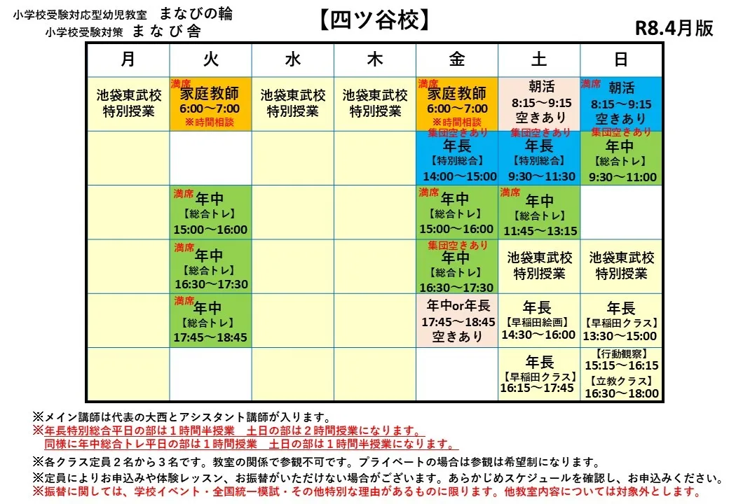 今年度もまなび舎/まなびの輪のほとんどの日程がうまっております。若干ではありますがグループ(少人数2名)の枠と個別で金曜日午後と土曜日朝活の枠がご案内可能です。個別では学校別対応していますのでまずは相談してください。すべての学校の対策に強い塾です。2025年(2026年度)は早稲田、立教、稲花小学校、女子校志望のご家庭が多く利用してくださいました。また、まなび舎/まなびの輪はいいだばし幼児教室と業務提携をしております。現在、池袋東武百貨店7階で教室を新設しました。教室提供や特別講師として代表の大西が授業を受け持っています。四ツ谷校でなくても、いいだばし幼児教室(飯田橋)や池袋東武校へ足をお運びください。池袋校では早稲田クラス、行動観察クラス、学校別クラス以外にも個別指導を行っております。ぜひこちらもご検討ください。