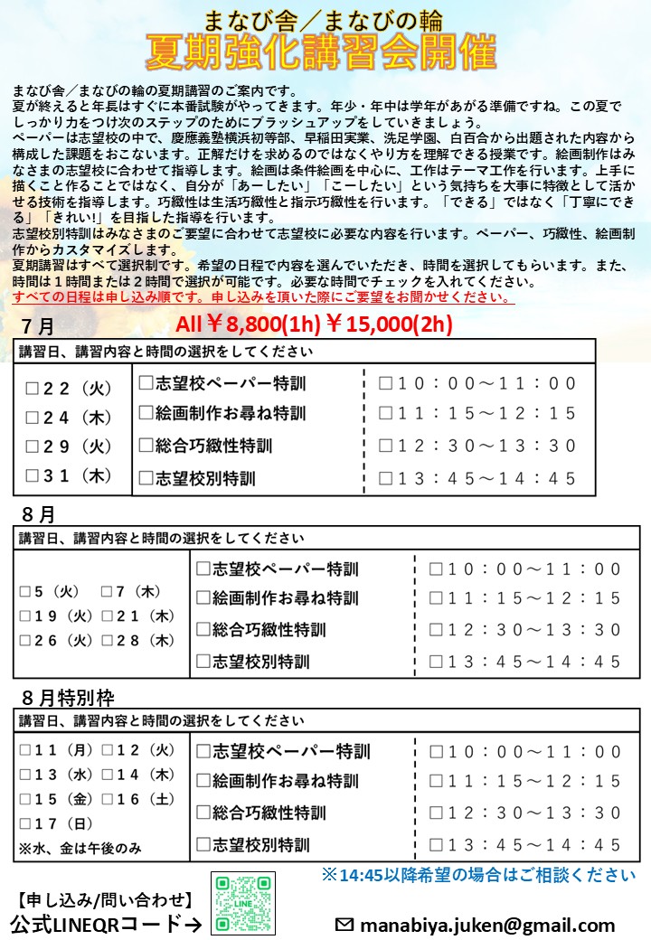 小学校受験 夏期講習開催!代表 大西の個別講習!まなびの夏にしよう!!東京 新宿 四ツ谷 幼児教室